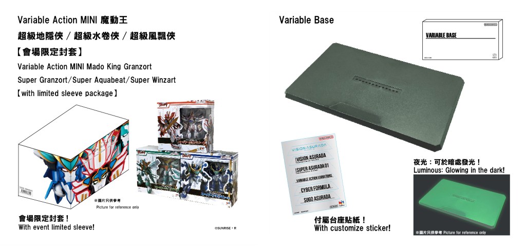同場亦會推出多款期間限定機甲玩具商品,將於3月30日在展覽中首賣,當中包括DLX鋼鐵俠Mark 50(黑金版)、ROBO-DOU宇宙騎士(threezero版本金屬色版)、MDLX洛克人(展覽限定版)預售、Variable Action MINI魔動王超級地隱俠、超級水卷俠、超級風飄俠封套(展覽限定版)等,每款限量發售,機甲迷切勿錯過入手時機,擁有屬於你的機甲模型!