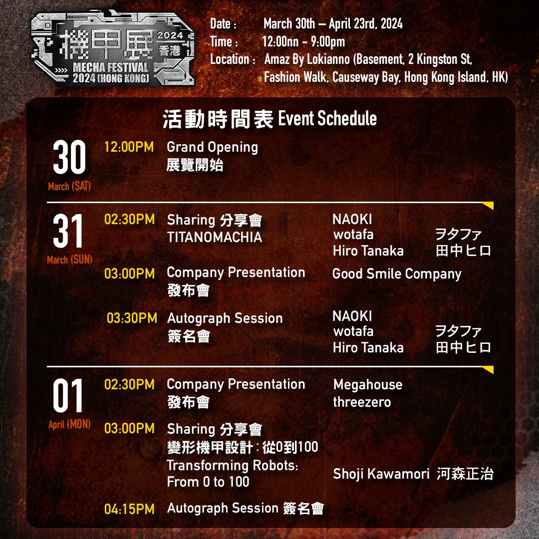 機甲玩具迷注意!機甲展2024(香港)登陸銅鑼灣!由香港玩具品牌threezero主辦,聯同日本頂尖機甲玩具品牌Good Smile Company、MegaHouse及千值練,於3月30日至4月23日進駐銅鑼灣玩具展覽店Amaz By Lokianno,展出最新最人氣的機甲模型首辦,同時推出一系列限定玩具商品,更邀請到日本玩具大師 — 設計師河森正治及模型師Naoki駕臨,出席分享及簽名會,與一眾機甲玩具迷近距離見面交流!