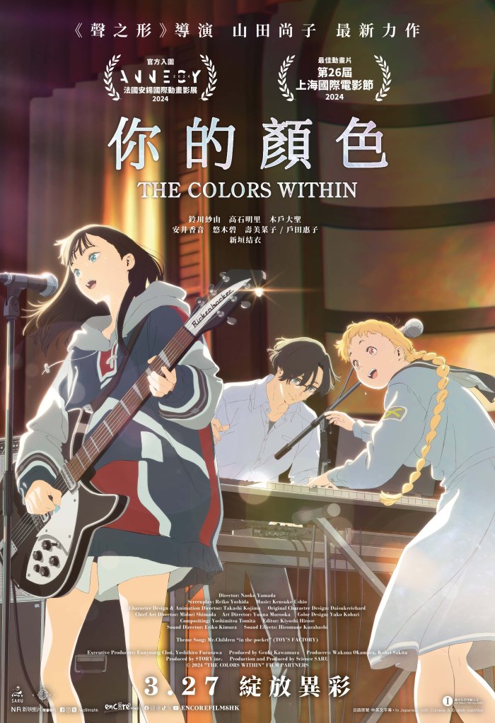睽違六年,《聲之形》、《莉茲與青鳥》之夢幻編導組合再度聯手,新作將登上香港大銀幕!全新電影《你的顏色》將於2025年3月10日隆重上映。本片榮幸獲選為法國安錫國際動畫影展入圍作品,更勇奪上海國際電影節最佳動畫片,講述三名年輕人各懷苦惱,卻同被音樂所吸引,最終在命運牽引下組成樂團,向世界呼喊出靈魂的色彩與聲音,道盡青春少艾的感傷與熱情!