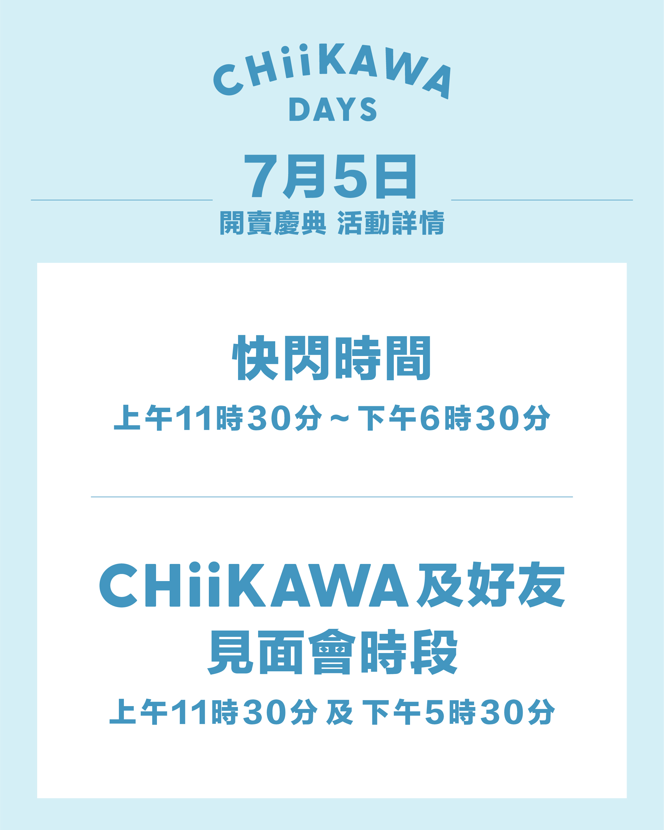 | Chiikawa及好友見面會 | 上午11時半及下午5時半 |
